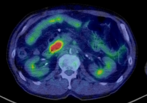 FDG-PET showed increased FDG uptake in the pancreatic head (SUV max 8.8).