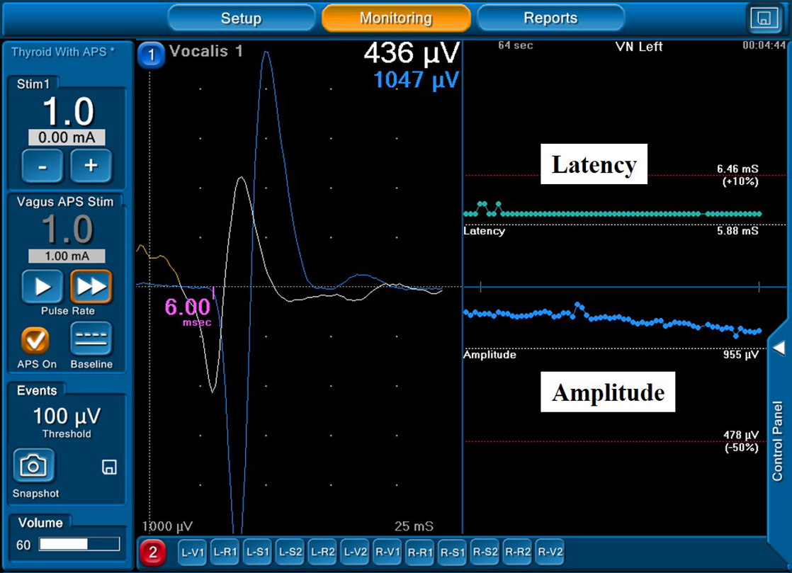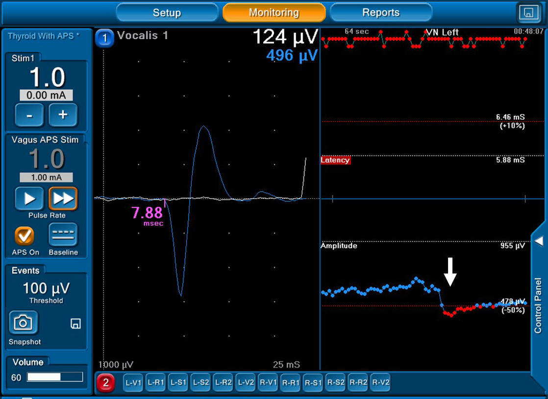 Signs of prolonged nerve latency and declined nerve amplitude were found in the nerve integrity monitoring system, when the left recurrent laryngeal nerve was retracted or stretched (white arrow).