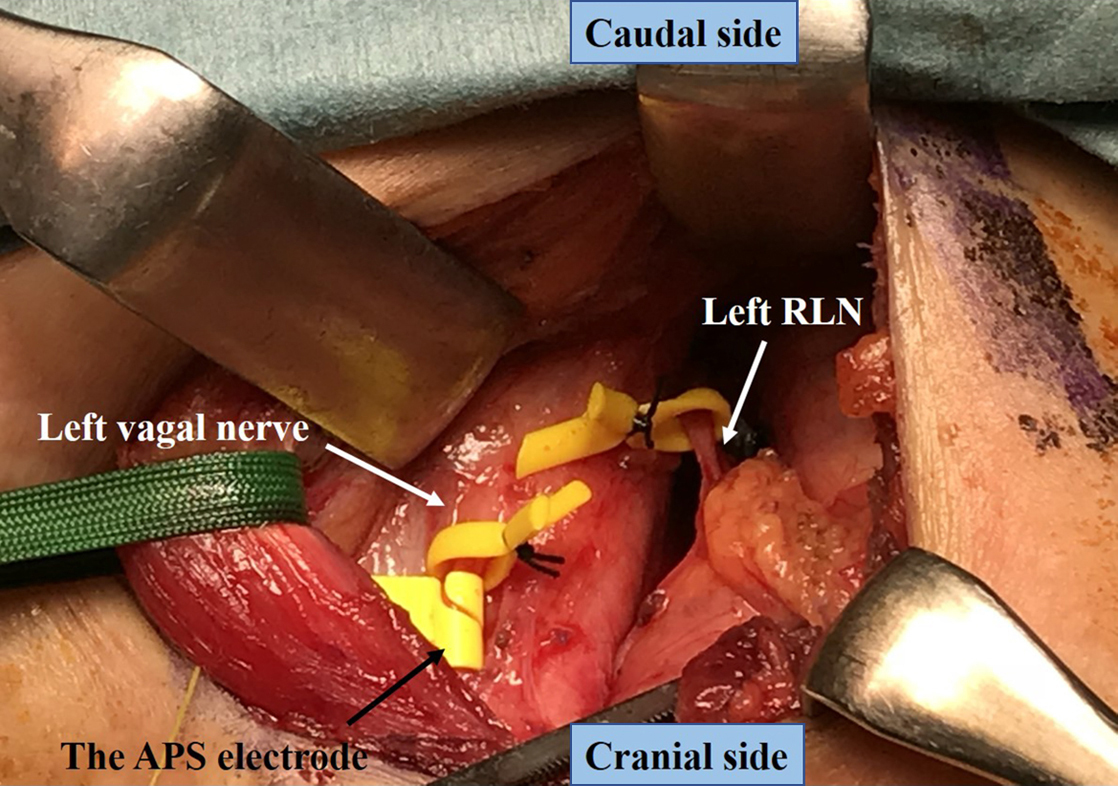 The operative findings of attachment of the APS electrode on the left vagal nerve inside carotid sheath. RLN; recurrent laryngeal nerve.