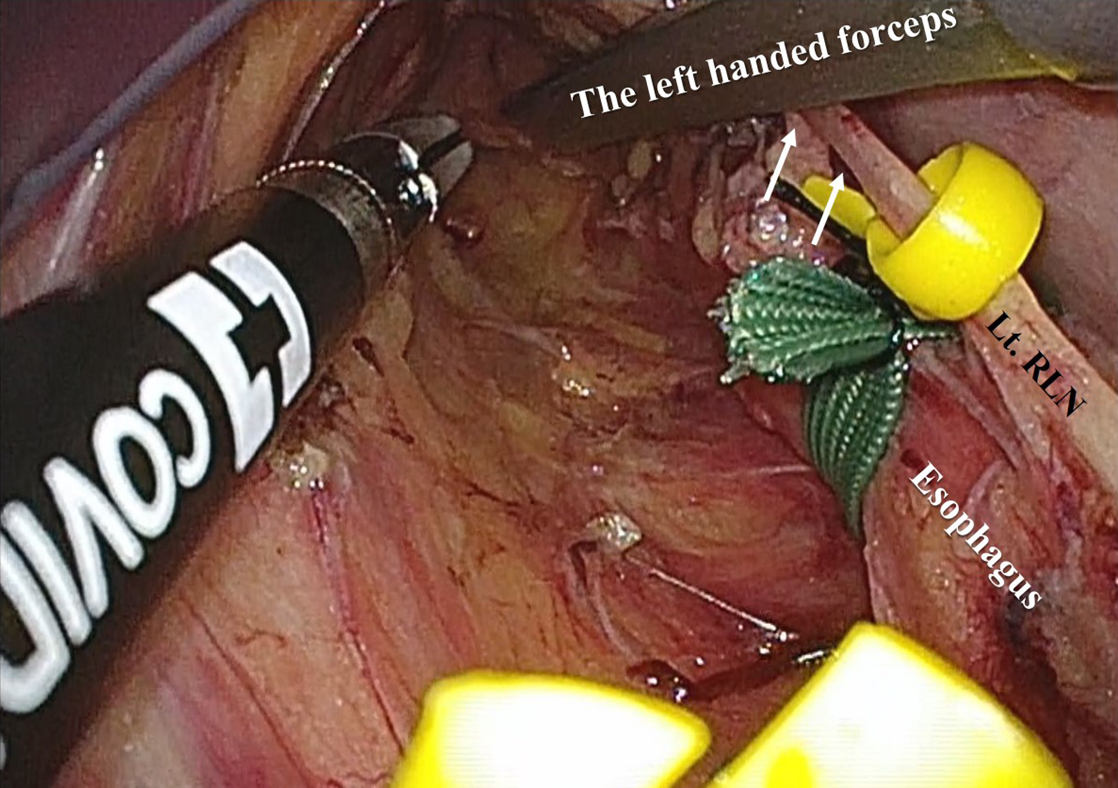 The nerve amplitude in the nerve integrity monitoring system was not changed by separating the adipose tissue from the left recurrent laryngeal nerve, or detaching the esophageal branch of the nerve during dissection of 106recL lymph nodes.