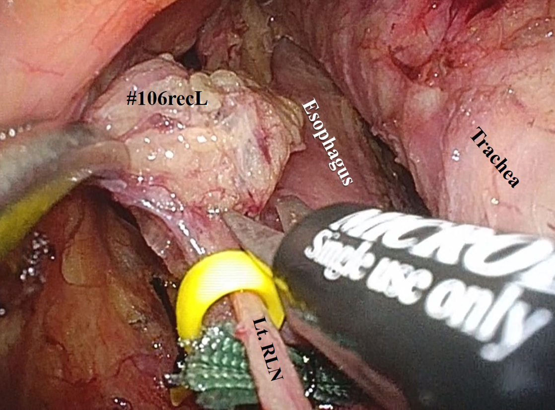 Dissection of the adipose tissue containing #106recL lymph nodes from the left recurrent laryngeal nerve (RLN).