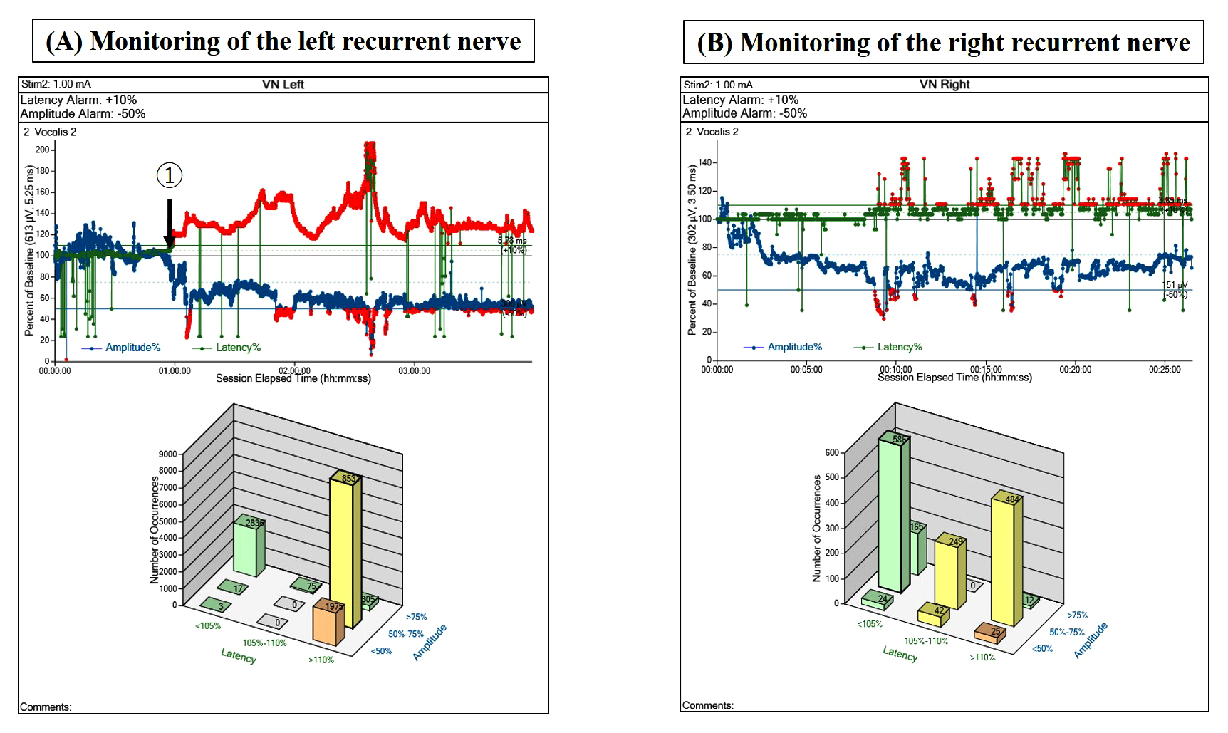 (A) Record of continuous intraoperative nerve monitoring in the left recurrent laryngeal nerve; the baseline of the amplitude was declined when the EZ access was inserted to the incisional wound (①). After that, the amplitude showed a stable line, except for the temporary declining by intraoperative maneuver. (B) Record of the continuous intraoperative nerve monitoring in the right recurrent laryngeal nerve; the latency and amplitude were almost kept at the baseline throughout the procedure.