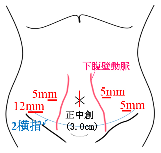 ・臍正中3.0 cm切開し,Lap Protector(M)を装着後,E・Zアクセス®を装着,12 mm trocar×1を挿入した.腹腔鏡は10 mm軟性鏡(オリンパス)を使用した.右下腹部に12 mm,右上腹部と左上下腹部に各々5 mm trocarをそれぞれ1本ずつ挿入した.腹腔内を観察するに肝転移や腹膜播種は認めなかった.