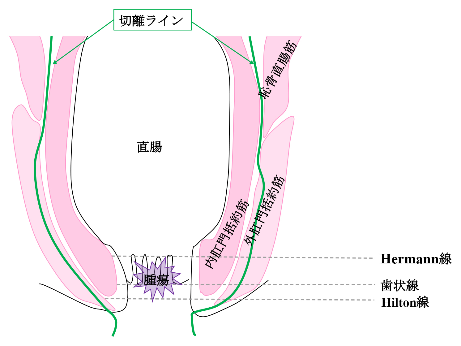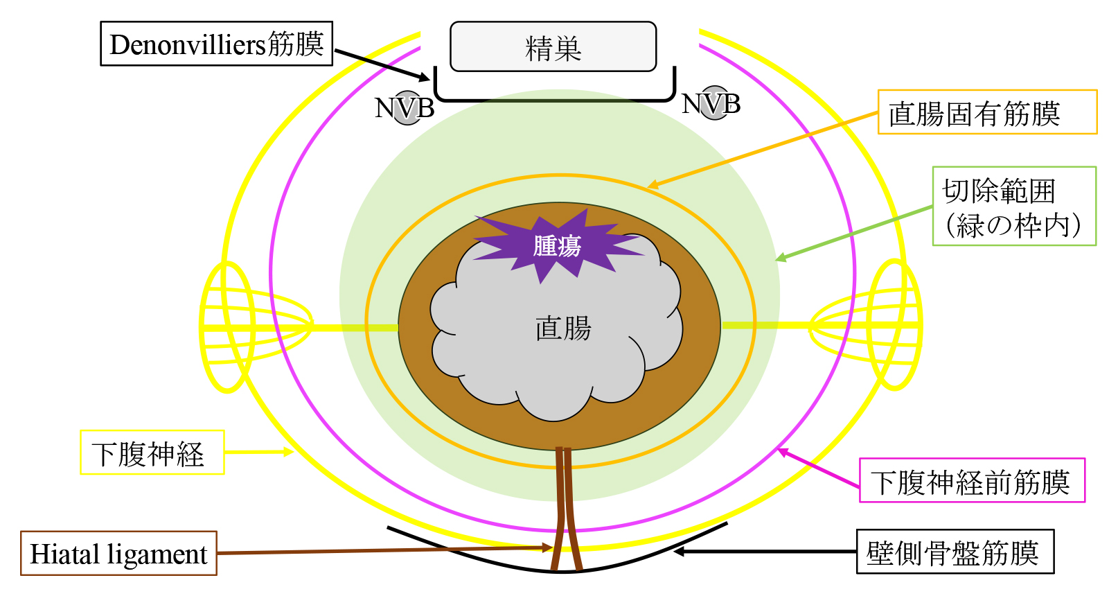 ・前壁はDenonvilliers筋膜を切離する層で剥離を行い,後方と側方は直腸固有筋膜と下腹神経前筋膜の間の層で,尾側は肛門挙筋を同定し,hiatal ligamentを切離し一部肛門挙筋を切離した.
