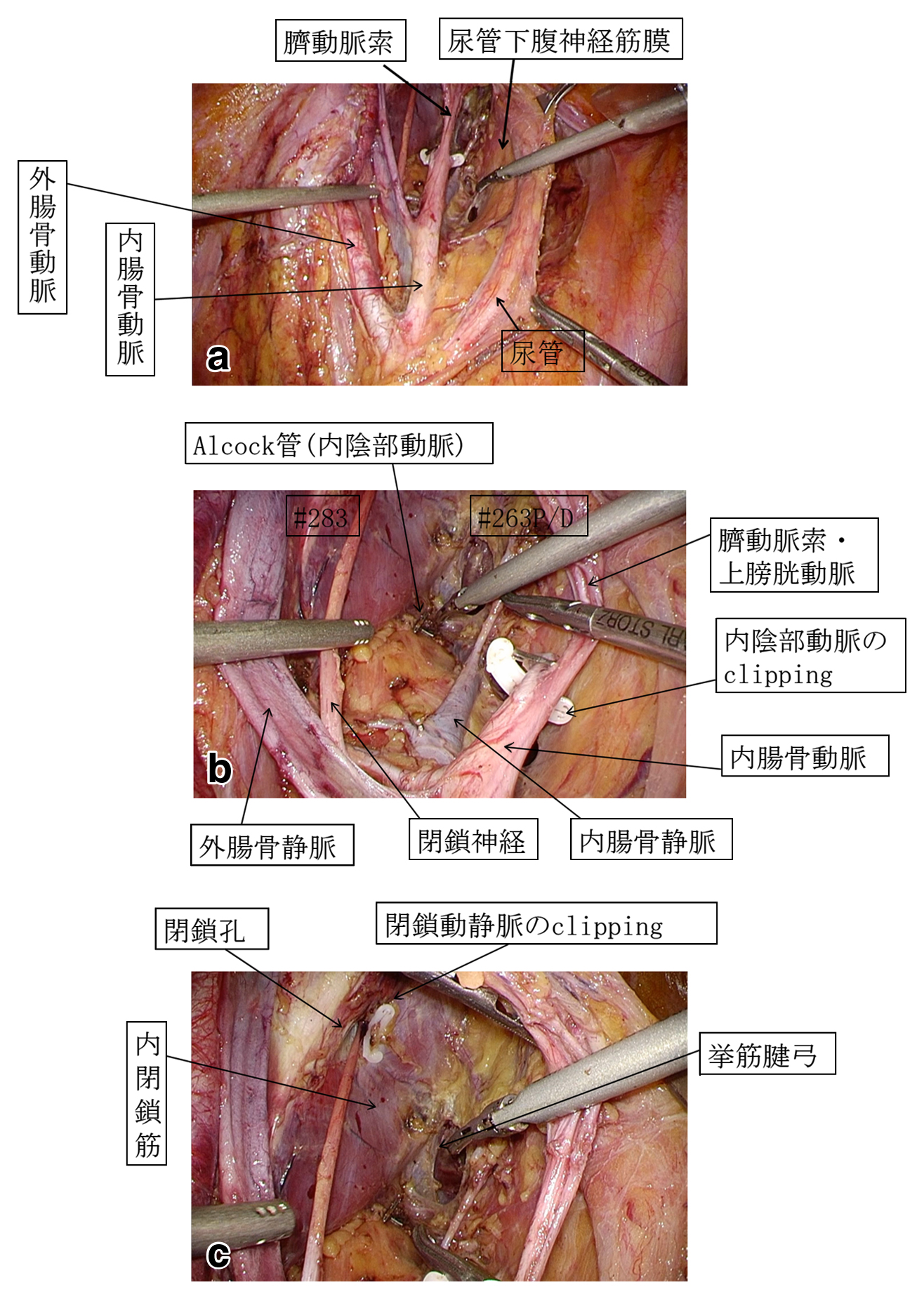 ・尿管外側を尿管下腹神経前筋膜に沿って膀胱まで剥離し,#263P/Dの内側縁を決定した.内外腸骨動脈分岐部から外腸骨動脈前面を切開露出し,輸精管を尾側剥離の指標として腹膜を切開した.外腸骨静脈の前面~内側を剥離し大腰筋・内閉鎖筋・肛門挙筋腱弓を#283外側縁とした.