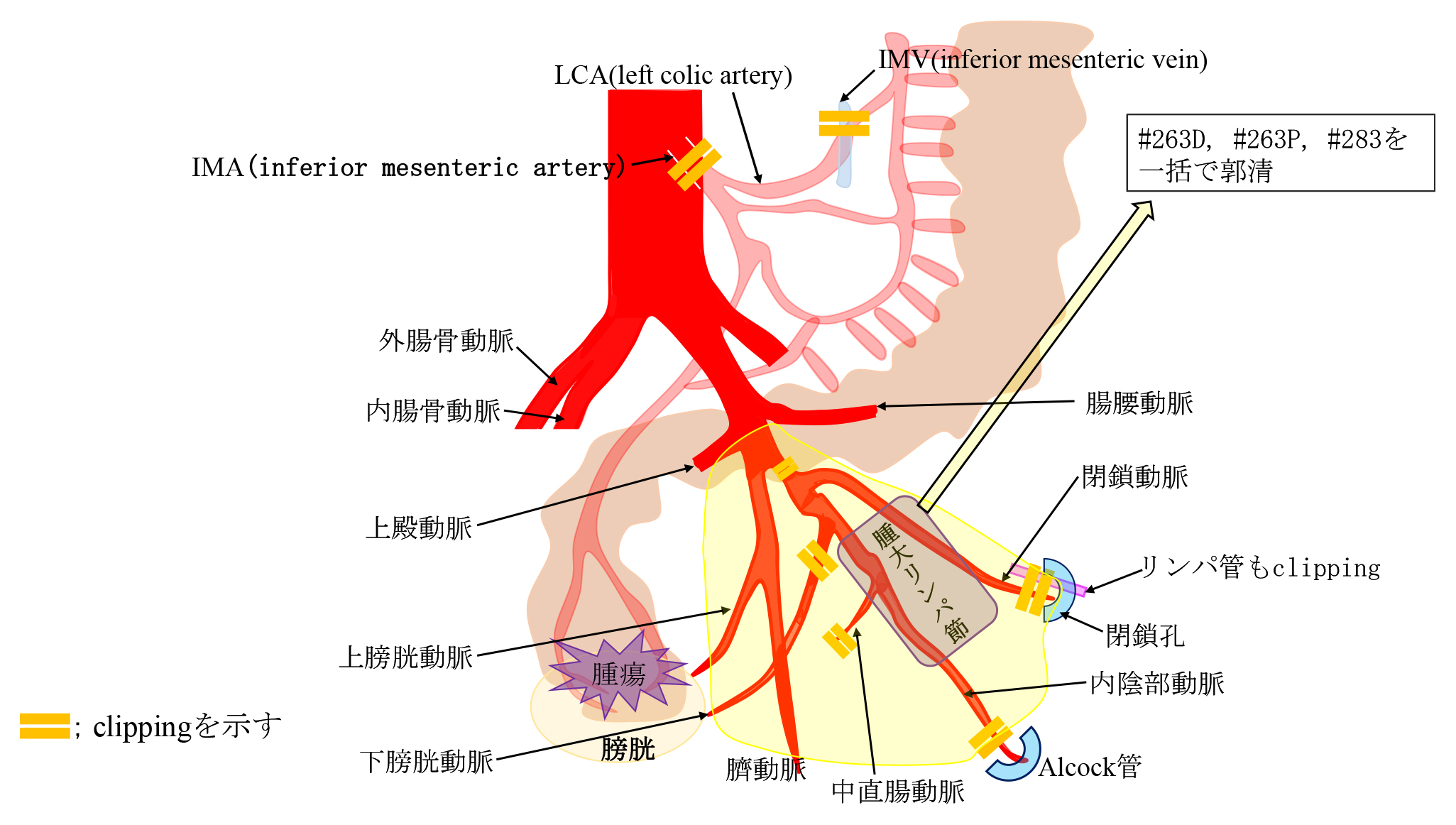 ・術前画像検査にて内腸骨動脈周囲のリンパ節転移を疑っていたために内陰部動脈合併切除の方針とし,内腸骨動脈は臍動脈索・上膀胱動脈が分岐した後でクリッピング切離し,末梢も全てクリッピング切離した.内腸骨静脈系は転移リンパ節浸潤による#263#283と癒着を認めず,閉鎖静脈以外は全て温存した.また,伴走するリンパ管もクリッピング切離し#263/283を一塊として摘出した.