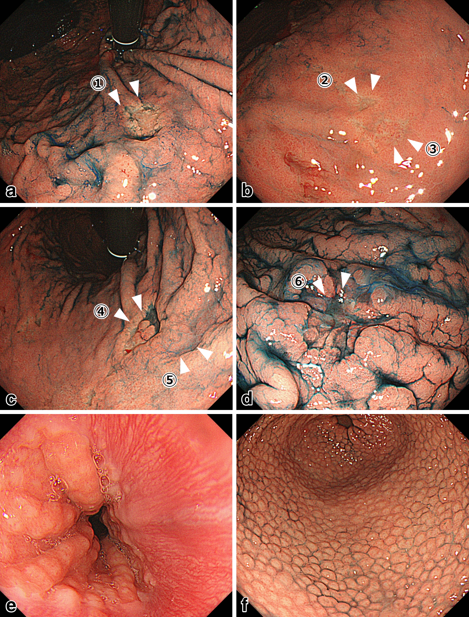 Upper gastrointestinal endoscopy. (a) 0-IIc lesion in the U, Less, (b) two 0-IIc lesions in the M, Less, (c) two 0-IIc lesions in the M, Post, (d) type III lesion in the M, Ant, (e) nodular gastritis in the cardia, (f) nodular gastritis in the antrum.
