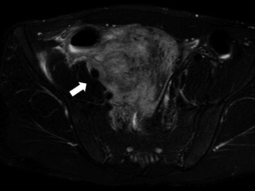 The right external iliac artery was involved in the tumor by contrast enhanced MRI (arrow).