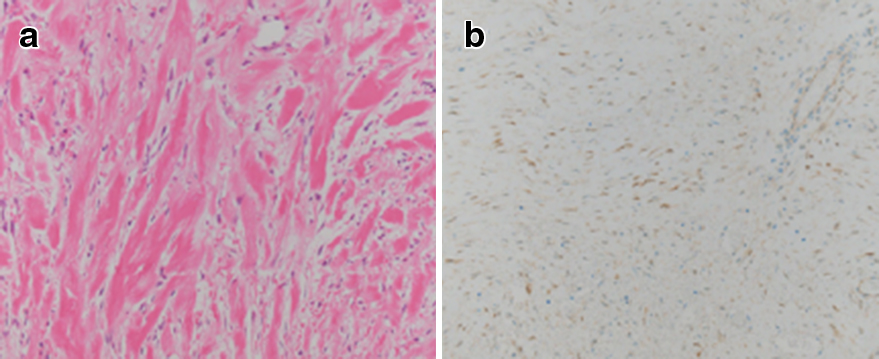 a: The histological findings showed plexiform of spindle cells (HE stain, ×100). b: Nuclei were positive for β-catenin (HE stain, ×100).