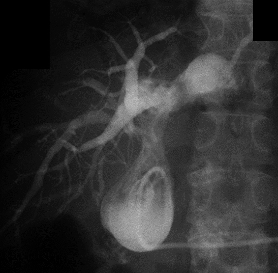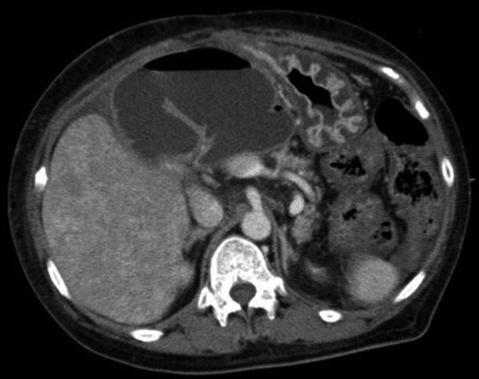 血液生化学的検査所見:WBC 12,600/μl,CRP 8.6 mg/dl,T-Bil 5.3 mg/dl,AST 40 U/l,ALT 26 U/l,γ-GTP 702 U/l,ALP 1,500 U/l.