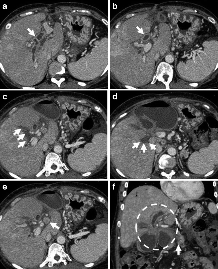 a) Choledocho-jejunostomy was indicated by the white arrow in contrast enhanced CT, and the wall thickness of the hepatic duct was shown with contrast enhancement. b) The undilated jejunal limb was demonstrated by the white arrow. c-d) Soft tissue infiltration was widespread. e) A lymph node of the hilus hepatis was enlarged. f) The jejunal limb was involved in the soft tissue mass and was dilated. White arrow indicating the pancreatico-jejunostomy.