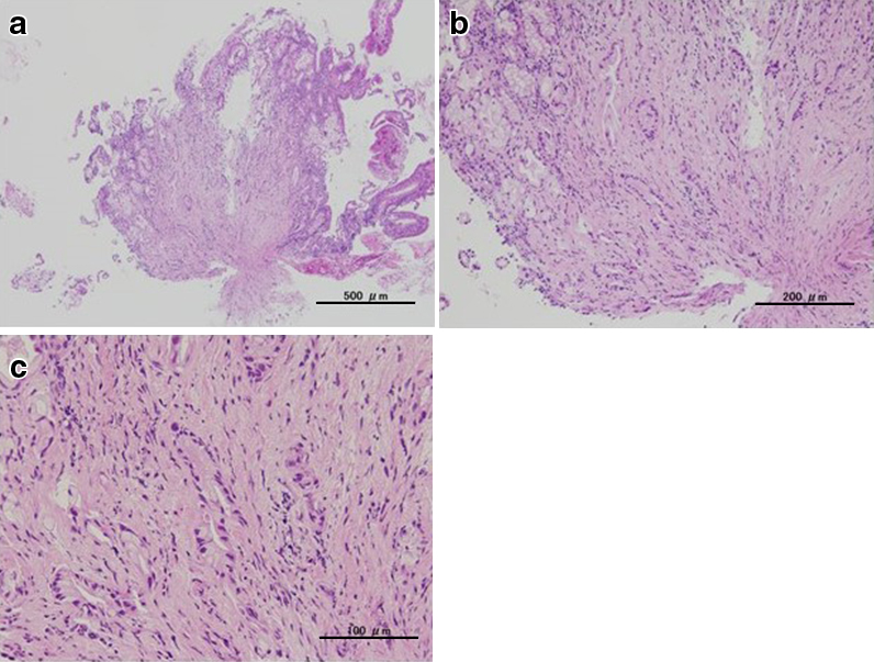 a–c) Sections shows the proliferation of atypical epithelial cells with abundant intracytoplasmic mucin and hyperchromatic nuclei, forming irregular tubules with stromal invasion.