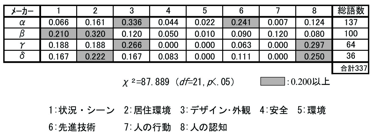 この表でも, 各カテゴリーに分類された形容詞の語数を出現率に換算した. 各カテゴリーの出現語数をχ2検定して有意な差を認め, 0.200以上のセルに網掛けした. これにより, メーカーαとβでは「室内空間」, γとδは「室内空間」と「付加価値」で高い比率を表し, イメージの特徴が示された.