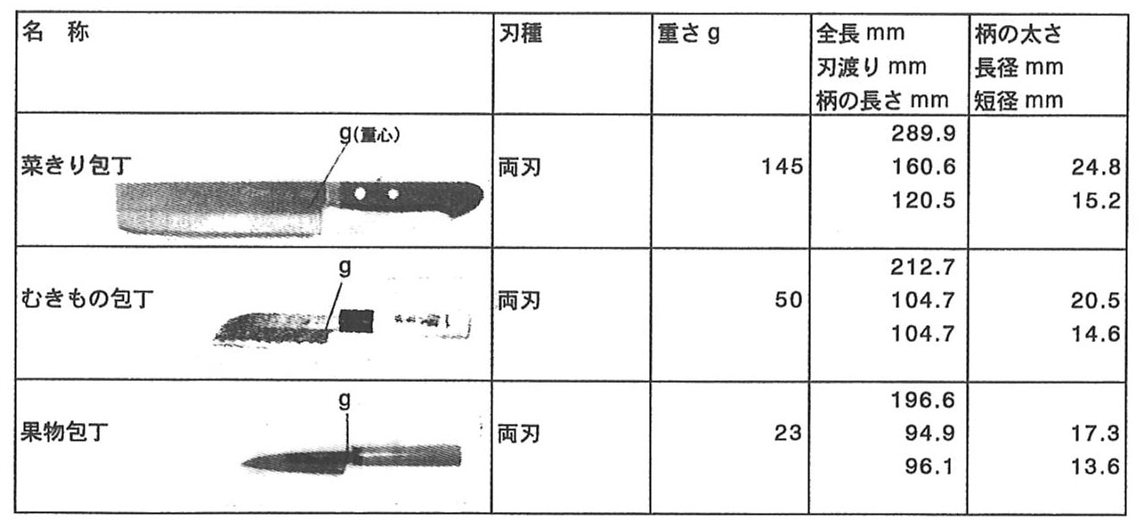 最近は子どもの調理参加の増加傾向から, 成人用の包丁を小ぶりにした子ども用の包丁(質量約60~70g, 刃渡り約11~13cm)が数種市販されている. 子どもの包丁使用については, 成人向きの包丁の大きさや形状が恐怖感の誘因になっているとの報告があり(松浦, 武井, 1983), 形状や大きさについては検討されているが, 質量に関する研究は行われていない. 従って, 市販の子ども用包丁の質量は大きさより決められたものと推察する. 包丁が与える危険に対する恐怖の究極は“手を切る”にある. 本研究においては刃を落とした包丁と同包丁で切断可能な切断物を用い恐怖感に対する要因を排除し, 児童が使いやすい包丁の大きさ, 重さ, 形状を子どもの手指の大きさと把持力に焦点をあて研究した.