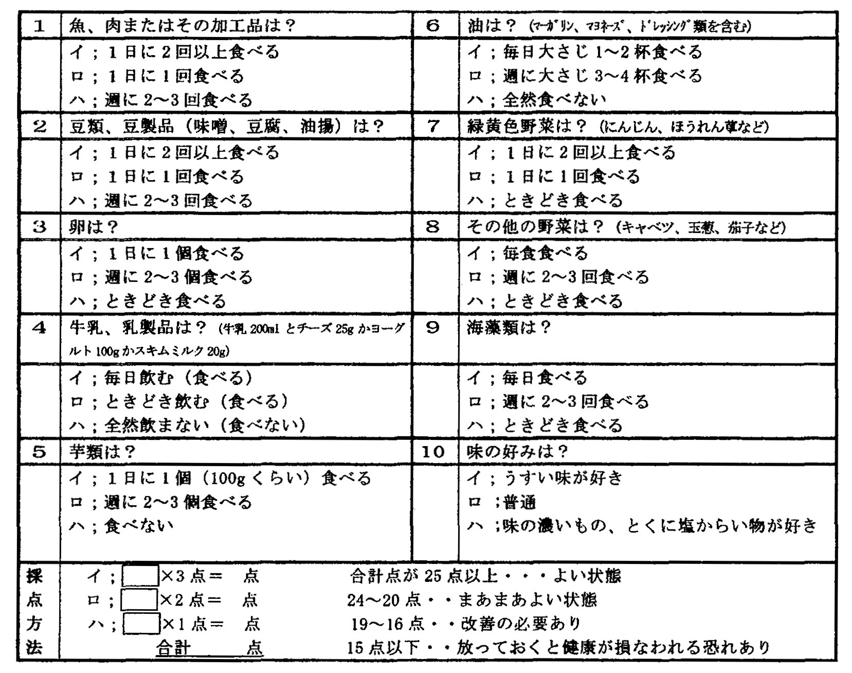 調査は平成15年7月, 東京都内の女子短大生80名(生活科学科2年次)を対象に行った. 社団法人・栄養改善普及会発行「I & you」の「10のチェックポイント」(2003)をアンケートIとして使用し, 食事摂取状況に関する調査を行った. さらにアンケートIIとして主食・外食・中食・嗜好品の摂取状況の調査を行った. アンケートIの質問事項はTable 1の通りである. 質問項目1~10の回答結果を点数化し, これを全体の採点結果とした. 採点方法は, アンケートの回答結果の中から, (イの回答数×3点)+(ロの回答数×2点)+(ハの回答数×1点)として集計し, 合計点数を求めた. 合計点数が25点以上を「状態がよい」, 24~20点を「まあまあよい状態」, 19~16点を「改善の必要あり」, 15点以下を「放っておくと健康が損なわれる恐れあり」と評価した. アンケートII(Table 2)」は単純集計しアンケートIと併せて食嗜好に関する意識を考察した.