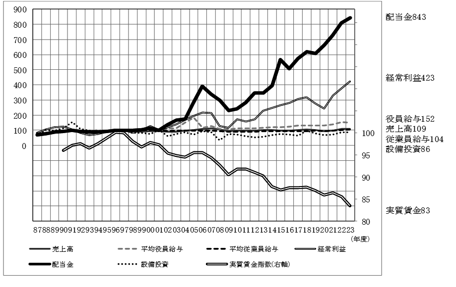 以上本節において、株主配当金が大幅に上昇し、2023年は従業員給与の約6割、設備投資とほぼ同額が配当金として社外流出していること、付加価値上昇が従業員給与改善とはなっていないことを論じた。