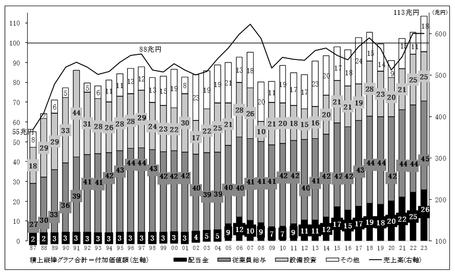 3.2 付加価値分配行動の分析図2は従業員給与、設備投資、配当金、その他の各々の総額、それらの総和である付加価値額の推移(左軸、積上縦棒グラフ、単位:兆円)と売上高の推移(右軸、折れ線グラフ、単位:兆円)である。