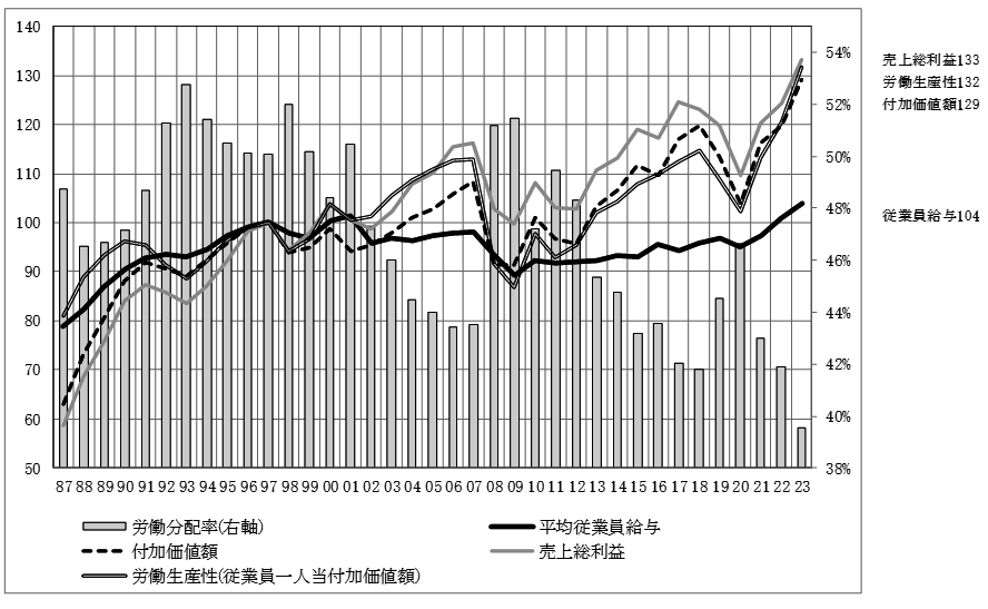 前節で見たように大企業の2023年の経常利益、当期純利益は共に過去最高となっていた。その要因のひとつとして特に製造業における製造ラインの外注・アウトソーシング化、正規工場労働者の短期契約や派遣労働者への切りかえによる売上原価の低減が売上総利益を改善させていることが考えられる9)。つまり、企業が直接従業員を雇用し製品やサービスの製造や販売を行う生産体制から自社の製造設備そのものを外部に貸し出し製造する外部委託製造、自社製造設備に非正規雇用者(短期雇用者や派遣労働者等)を配置し製造する形態など企業の製造部門の組織的な変化が大きく影響しており、それらが企業の売上総利益を押し上げる結果となっているのではないだろうか10)。