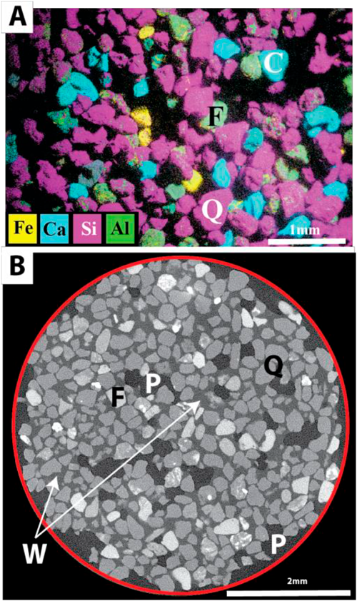 A) Scanning electron microscopy energy dispersive X-ray (SEM-EDX) map of the beach sand. Medium grain size (250–500 µm). Predominantly quartz. Grains (Q)—magenta, carbonate particles (C)—blue, and feldspar (F)—green. B) X-ray tomography (XRT) slice through the beach sand. Key as in (A) with the addition of pore (P) and water (W). Note that water forms a meniscus between grains, as viewed in the sands moist collected state—leaving ample environment for microorganisms including testate amoebae.