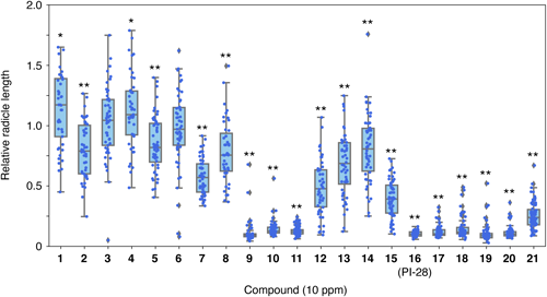3. Measurement of germination rate and radicle lengthImages of germinating seeds were obtained with a digital microscope (DMS1000, Leica). The germination rate was measured as reported previously.24) The radicle lengths were measured using Image J software. The radicles of 10–30 seeds in two or three images obtained with a microscope as shown in Fig. 1B were measured as much as possible for samples in a Petri dish, with the average lengths of at least 30 radicles in three Petri dishes being calculated. The numbers of measured radicles were indicated in Table S1. Student’s t-test and Turkey–Kramer test were conducted with SciPy (Version 1.5.2) and Pandas (Version 1.1.3) modules, respectively, in Python (Version 3.8.5). Relative radicle lengths of O. minor treated with aryloxyacetylthioureas to those of the control were determined to compare the effects among different experimental batches.