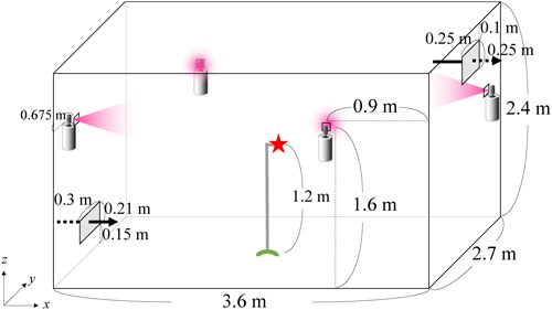 Aerosol sprays containing active substances intended for controlling flies and mosquitoes are used widely throughout the world. However, risk assessments of these active substances based on guidelines1–3) might not fully reflect realistic scenarios. For example, the U.S. Environmental Protection Agency’s (US EPA) guideline represents the decay of airborne concentrations after indoor use solely through air exchange2) and assumes that all sprayed active substances settle on the floor.2) Similarly, the European Chemicals Agency’s guideline also assumes that all sprayed active substances settle on the floor.3) In reality, aerosol particles containing active substances are released and deposited not only on the floor but also on walls and ceilings owing to the effects of gravity and airflow.4) Additionally, the size of the aerosol particles diminishes as the solvent components volatilize,5) and they are also emitted together with the exhaust air.6) The Japan’s guideline states that risk will be assessed by measuring the average concentration after spraying aerosols in a 6-tatami size (approximately 9.72 m2) room with an air exchange rate of 0.5 hr−1 and measuring the air concentration as representatively as possible across the indoor space over time.1) However, the spraying methods and indoor environmental conditions are not fully specified in the guideline. In practice, despite widespread use of aerosol sprays for controlling flies and mosquitoes, the detailed spatiotemporal behavior of the active substances after use remains inadequately understood, and current risk assessment methods might not fully account for real-world conditions. For example, they do not consider the spraying method, such as whether the aerosol is applied in one direction or distributed evenly by rotating the spray. They also overlook factors for indoor environmental conditions such as the position of air inlets, arrangement of furniture in the room, and behavior of residents, i.e., whether they remain active or go to sleep after spraying the aerosol.