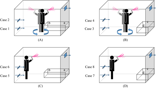 Regarding differences in breathing zones above the bed, as shown in Supplemental Table S2, for the longitudinal position, the concentration at position “b” (the center of the airflow vortex) was generally higher than that at position “a,” except in Case 1. Conversely, for the lateral position, the concentration at position “c” was higher in the All-direction spraying method, while position “d” was higher in the One-direction spraying method. This was because, in the All-direction spraying method, the concentration near the sidewalls was higher than that at the center of the floor, causing particles to accumulate at position “c” owing to airflow transport. In the One-direction spraying method, position “d” was directly beneath the spray (F in Fig. 9), resulting in higher concentrations at that position.