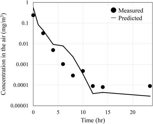 1. Behavior of the active substance in the room after Four-direction spray1.1. Comparison of temporal changes in airborne concentration between measured and predicted valuesThe measured and predicted airborne concentrations by using InPestCFD at the height of 1.2 m in the center of the floor over a 24-hr period following spraying from four-direction under the exchange rate of 0.5 hr−1 are shown in Fig. 4 for the purpose of comparison. The measured airborne concentration was obtained by sampling air for 20 min; therefore, predicted concentration was also calculated by dividing the sum of the amounts of the active substance in the air and particles passing through the calculation cell over 20 min by the cell volume. Both the measured and the predicted airborne concentrations exhibited a relatively rapid decay immediately after spraying owing to the settling of aerosol particles and air exchange. After 12 hr, the concentrations decayed gradually owing to the revolatilization of the active substance from the room materials into the air. When calculating the daily average airborne concentration based on the measured values (black circles) and the predicted values (solid line) in Fig. 4, the measured value was 13.4 µg/m3, and the predicted value was 18.1 µg/m3, showing no noticeable difference.