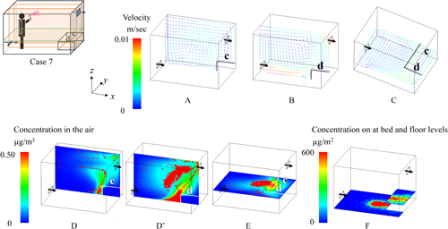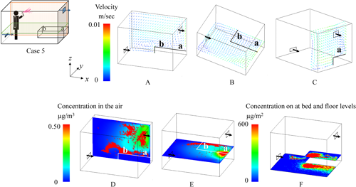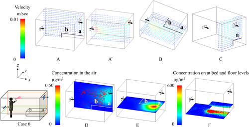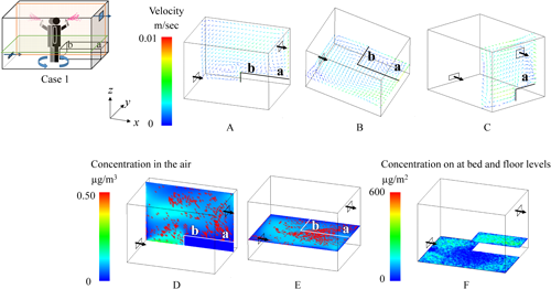 2.1. Effects of spraying methodsNotable differences in the behavior of the active substance between All-direction and One-direction spraying were observed under the condition where the air inlet was at the lower level, and the bed was placed longitudinally (Figs. 6 and 7). In the figures, the color of the velocity arrows in the upper row represents the speed, while the direction of the arrows indicates the flow direction. The color of the concentration in the lower row represents the concentration of the active substance. In this figures, higher concentrations are represented by red coloring, and because the red coloring is depicted as dots, it inherently represents aerosol particles with high concentrations of the active substances, while the blue areas represent the active substances in the air with relatively low concentrations. The particles after All-direction spraying were distributed relatively evenly throughout the room (D and E in Fig. 6). Additionally, in All-direction spraying, the aerosol was sprayed outward from the center of the room, meaning that the concentration near the center of the floor was relatively low, while the surrounding area showed a more uniform distribution (F in Fig. 6). The airborne concentration after One-direction spraying showed an uneven particle distribution, even 1 hr after spraying, which was influenced by the initial uneven dispersion of particles during spraying (D and E in Fig. 7). Regarding the residual concentrations on the bed and floor, deposition occurred from the center of the room toward the exhaust side, with the spraying method strongly affecting the deposition pattern (F in Fig. 7).