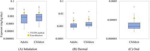 3. Risk assessment3.1. Comparison of the exposure levelsThe inhalation, dermal, and oral exposure levels for adults and children were calculated based on airborne concentrations and residual concentrations on the floor or the bed. For the real-world scenarios of All-direction and One-direction spraying, 24 scenarios were evaluated, comprising three exposure types (two sleep scenarios and one awake scenario) across eight cases. The two sleep scenarios were considered separately because the position of the head on the bed differs between them. The distribution of these exposure levels is presented in the box plot (Fig. 10). The exposure levels for Four-direction spraying (yellow circles in Fig. 10) were notably high, corresponding to approximately the 95th percentile of the exposure levels in the real-world scenarios. The exposure levels calculated by the US EPA method (asterisks in Fig. 10) were much higher than the exposure levels in the real-world scenarios.