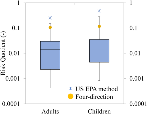Based on the calculated exposure levels, the RQ was determined according to the approach described in Method 3.3. The RQ values obtained using the US EPA evaluation method (asterisks in Fig. 11) were 0.25 for adults and 0.47 for children, while the RQ values for Four-direction spraying (yellow circles in Fig. 11) were 0.11 for adults and 0.12 for children. In all cases, the RQ values were below 1, indicating no concern regarding risk.