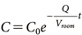 where Vroom (m3) represents the indoor volume, set to 23.3 m3, and Q (m3/hr) represents the airflow rate, set to 11.65 m3/hr, based on the measured conditions outlined in Section 1. Assuming that the initial concentration at t=0 is C0 (mg/m3), the indoor concentration C is expressed by Eq. (2), where C0 (mg/m3) is calculated by dividing the sprayed amount of the active substance by Vroom: