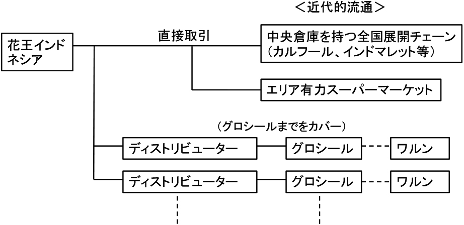 インドネシアの流通は,「ワルン」と呼ばれる零細小売店を始めとする伝統的流通業が多くを占め,外資小売業も進出し始めていたとはいえ,全般的に流通近代化は遅れていた。また,いくつもの島嶼部によって市場が分断されており,ジャワ島とそれ以外(外島)では,流通機構の発達に大きな格差があった。