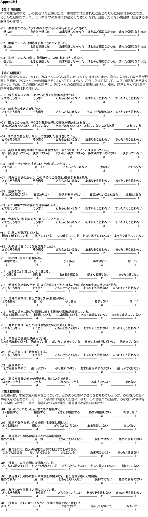 3) 倫理的配慮 本研究にかかわる調査を実施するに当たり、保護者に対する説明・協力依頼を行った際、回答は任意であることも説明した。また、ホームルームの時間に教員が行った調査時にも同様の説明を行った。なお、収集したデータに関しては、1~3期のデータを統合した後、データを統合するために利用した出席番号情報は削除して分析に利用した。