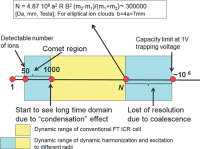 How to shift the upper limit to the limit of cell capacity?To lift the upper limit of the dynamic range we need to prevent coalescence and small ion cloud destruction by bigger clouds of ions with close m/z ratio. Both these phenomena could be prevented by increasing the magnetic field and by the excitation of different m/z ions to different cyclotron orbits.20)