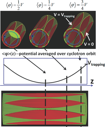 For condensation to take place in an open compensated cell for the same cyclotron radius as in an open cell without compensation around ∼5,000 ions are required. Compensation is also observed in the case of an inhomogeneous magnetic field. Figure 1A shows that in the case of quadrupolar electrostatic field and uniform magnetic field there is no destruction of ion cloud and comets formation. A more detailed analysis of ion trajectories obtained in the simulation shows that increase of number of ions in an ion cloud leads to dramatic effect on distribution of ion axial oscillation amplitude. As the total ion number increases the axial oscillation average amplitude slightly increases but the amplitude distribution width decreases. This leads to equalizing the effective cyclotron frequency of ions in ion cloud, and preventing comets formation.