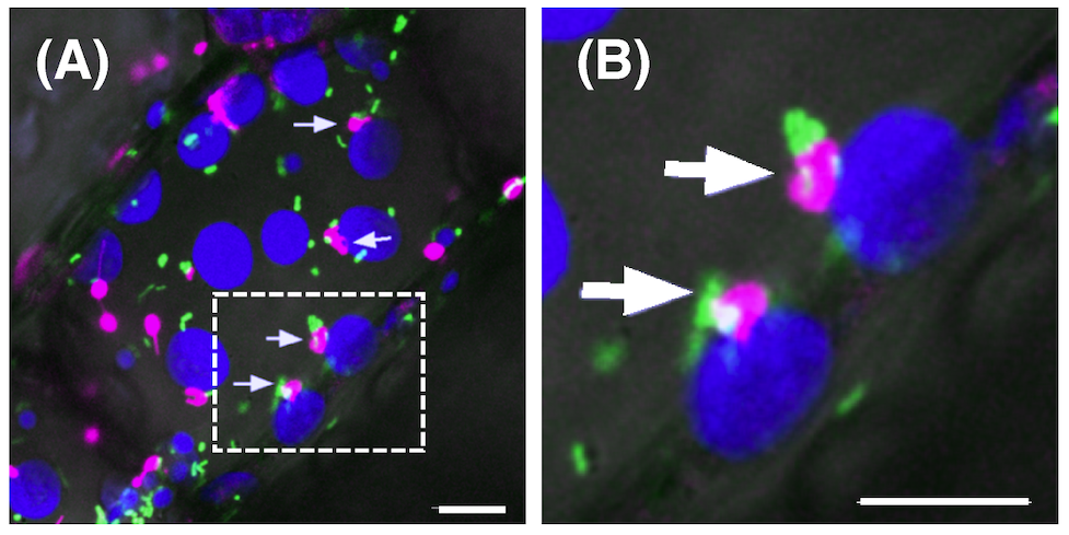 図2 ペルオキシソーム、ミトコンドリア、葉緑体間の相互作用。(A-B) シロイヌナズナ葉肉細胞内の葉緑体(青)、ペルオキシソーム(マゼンタ)、ミトコンドリア(緑)の共焦点レーザー顕微鏡画像。3つのオルガネラ相互作用を白矢印で示した。(B) は (A) の点線で囲んだ部位の高倍率像。 Bars = 5 µm。
