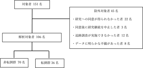 包含基準に該当した対象者は151名であった。このうち,研究への同意が得られなかった者22名,同意後に研究継続を中止した者3名,追跡調査が実施できなかった者12名,データに明らかな不備があった者8名を除外し,最終的な解析対象者は106名となった(図1)。