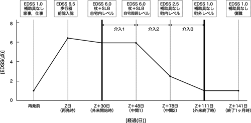 本症例の発症前から外来終了1カ月後までのEDSSと歩行機能,生活活動範囲を図2に示す。発症前はEDSS 1.0で,家事や育児,就業を行っていた。Z日より増悪を認め,EDSSが6.5(歩行器歩行レベル)となった。初回評価のEDSSは6.0,ロフストランド杖とオルトップAFOを要し,生活範囲はLSA 12.0点(自宅内レベル)で家事や育児に介助を要した。中間1でEDSSは6.0と初回評価時から不変であったが,易疲労性が軽減しLSAが16.5点(自宅周囲レベル)に拡大,家事も自立となった。中間2ではEDSSが2.5となり,屋外補助具なし歩行が自立,LSAは58.0点(町内レベル)に拡大し買い物も可能となった。最終評価のEDSSは1.0,LSA 60.0点(町外レベル)へと改善し,外来終了1カ月後でもEDSS 1.0を維持し,LSAも84.0点と拡大して復職に至った。