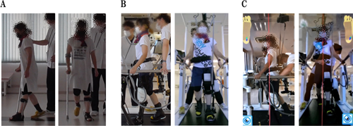 本症例では,介入2によるWW歩行練習を実施後に歩行機能改善を認めた(図2)。WW歩行練習は,本症例の左下肢運動麻痺や運動失調,感覚鈍麻によるback knee pattern(図5A)に左下肢荷重への恐怖感などの問題点を考慮し導入した(図5B)。WWは,両側手すり付きトレッドミル型歩行補助ロボットで,ロボット脚にて立脚期膝伸展や振り出しの補助が可能である。補助値は膝伸展が10段階(レベル10:目標トルク約80 Nm~レベル1:目標トルク2 Nm),振り出しが6段階(レベル2:ロボット脚の重量分を相殺,1段階の変化毎に0.5 kg補助量が変化)で調整が可能である18)19)。また,前方モニターによる前額面や矢状面,足元のFBが可能である18)19)。本症例への補助設定として,膝伸展補助は同機器で評価可能な膝関節角度を基準に,立脚初期~中期にて適切な運動となるよう調整し,振り出し補助は過剰なぶん回しとならないよう設定した。さらに,前方モニターには,前額面と矢状面の映像に垂直線を表示し,体幹やぶん回しの自己修正を促した。さらに,疲労感に合わせ左立脚期での股関節伸展や,遊脚期での骨盤引き上げを介助した(図5C)。歩行速度は平地歩行と同程度の0.60 m/sに設定し,連続歩行距離はBorg scaleで13となる距離に設定した。以上の設定にて,症例と歩容の問題点を共有することで,左荷重量増加やdouble knee actionの出現など即時的な歩容改善を認め,開始2週間で膝伸展補助値は4から1,振り出し補助値は3から1へ軽減し,1施行の歩行距離は14.0 mから67.2 mに改善した。