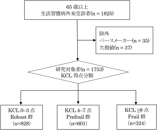 本研究は,2021年3月から2025年2月の期間に,みなみ野循環器病院(以下,当院)の生活習慣病外来を受診した65歳以上の高齢者のうち,医師が全調査項目の実施が可能と判断し,同意が得られた1825名を対象とした。このうち,ペースメーカー装着者35名およびKCLまたはCS-30測定値に欠損のあった37名を除外し,最終的に1753名を解析対象とした。なお,身体機能や認知機能に関する明確な除外基準は設けていないが,医師の判断により調査手順の遂行が困難とされた者は対象外とした。本研究は身体的侵襲を伴わない横断研究であり,外来診療時にすべての対象者からインフォームド・コンセントを取得した。対象者には,研究参加を拒否しても不利益を受けないこと,およびいつでも自由に同意を撤回できることを説明した。研究の実施にあたっては,ヘルシンキ宣言に基づき,みなみ野循環器病院倫理審査委員会(承認番号:MJ-088)の承認を得た。診療録から得た個人情報は,研究目的の範囲内で匿名化のうえ厳重に管理した。