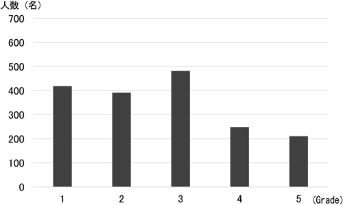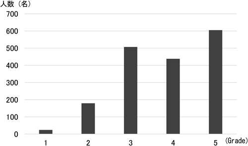 図2に,中谷らの従来基準に基づくCS-30の5段階評価を本研究対象者に適用した結果を示す。Grade 5(非常に良好)に分類された対象者が605名(34.5%)と最も多く,一方でGrade 1(非常に低い)に該当した者は24名(1.4%)にとどまった。