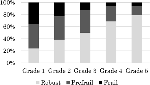 KCL分類(Robust/Prefrail/Frail)との関連をχ2検定により検討した結果,有意な関連が認められた(χ2=288.7, df=8, p<0.001)。また,グレード上昇に伴いフレイル割合が減少する線形傾向が確認された(Linear-by-Linear Association=268.0, p<0.001)。効果量(CramérのV)は0.29であり,中程度の関連を示していた。