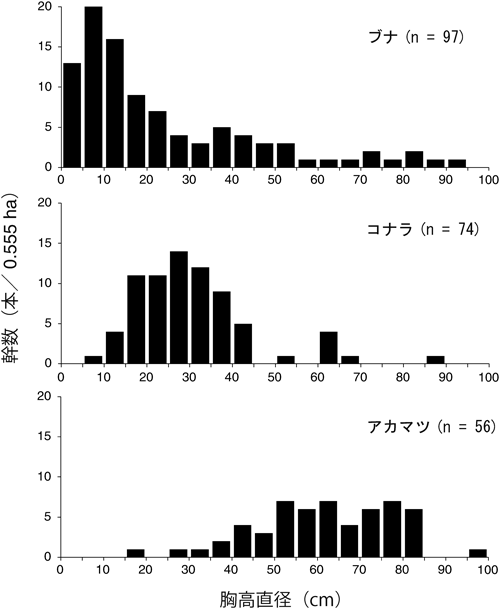 牛伏寺ブナ林では、胸高断面積合計においてアカマツ、ブナ、コナラの順に優占し、これら3樹種で全体の約9割を占めていた(表1)。樹高3 m以上のブナは、胸高直径分布の範囲が広く、L字型のサイズ構造を示したことから(図2)、長期にわたって継続的または断続的な更新が繰り返されてきたこと、すなわち定常的に新規個体が加入し続けたことが示唆される。一方、一山型のサイズ分布を示したコナラは、かつての薪炭利用の放棄に伴い、実生や萌芽により短期間に一斉更新が生じた可能性がある。また、アカマツの胸高直径分布は中・大径木が主体であったことから、コナラの薪炭利用放棄時よりもさらに以前に定着した個体が長期的に成長してきたと考えられる。これらのことは、里山としての林分利用履歴と自然更新の相互作用により現在の林分構造が形成されたことを示しており、小山ほか(2014)の見解を支持する結果である。