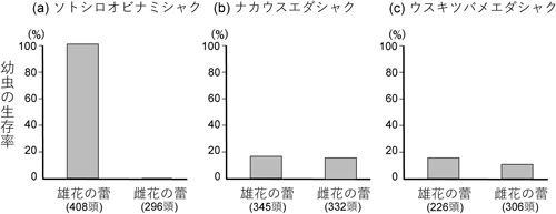 (a)ソトシロオビナミシャク (b)ナカウスエダシャク (c)ウスキツバメエダシャク。蕾のみを食べるナミシャクでは、生存率にヒサカキの性別が影響を与えた(a)一方、葉と蕾の両方を食べるエダシャク2種では生存率にヒサカキの性別は影響を与えなかった(b, c)。雄の枝を与えた場合、ナミシャクの生存率が他2種のエダシャクより高い(a, b, c)のは、若齢幼虫期にナミシャクは微生物が少ない蕾の中で成長する一方、エダシャクは微生物が多く付着する葉上で成長するため、病気に感染しやすかった可能性が考えられる。