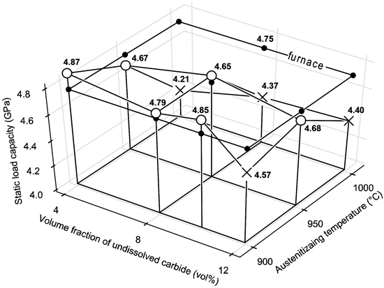 Influence of austenitizing temperature and volume fraction of undissolved carbide on static load capacity.