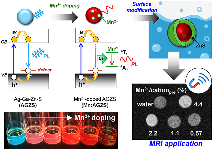 Transition metal-doped colloidal quantum dots (QDs) are promising candidates for dual-mode imaging due to their tunable optical properties and potential magnetic functionalities. Here, we report the synthesis and characterization of Mn2+-doped AgGaS2 (AGS) and ZnS-alloyed Ag–Ga–S (AGZS) QDs via a one-pot heating-up method. Upon Mn2+ incorporation, both AGS and AGZS QDs exhibited two distinct photoluminescence (PL) peaks originating from the host QDs and doped Mn2+ ions, with the relative intensities tunable by varying Mn2+-to-total metal cation ratio in the precursor (Mn2+/cationpre). The AGZS QDs prepared with Mn2+/cationpre ratio of 1.1 % exhibited a high PL quantum yield of 45 %, with 40 % of the emission attributed to the d-d transition of Mn2+ ions (4T1 → 6A1). Time-resolved PL measurements revealed efficient energy transfer from excitons in the host QDs to doped Mn2+ ions, contributing to enhanced Mn2+-related emissions. Surface passivation with a ZnS shell followed by ligand exchange with 3-mercaptopropionic acid allowed stable dispersion of AGZS QDs in aqueous media while retaining optical properties. Since the Mn2+-doped QDs also exhibited paramagnetic behavior, we investigated the performance of Mn2+-doped AGZS QDs as a contrast agent for magnetic resonance imaging (MRI). The intensity of the T1-weighted MRI signal increased with an increase in the content of doped Mn2+. These results demonstrate that Mn2+-doped AGZS QDs are promising single-component dual-mode (PL/MRI) nanoprobes for biomedical imaging applications.